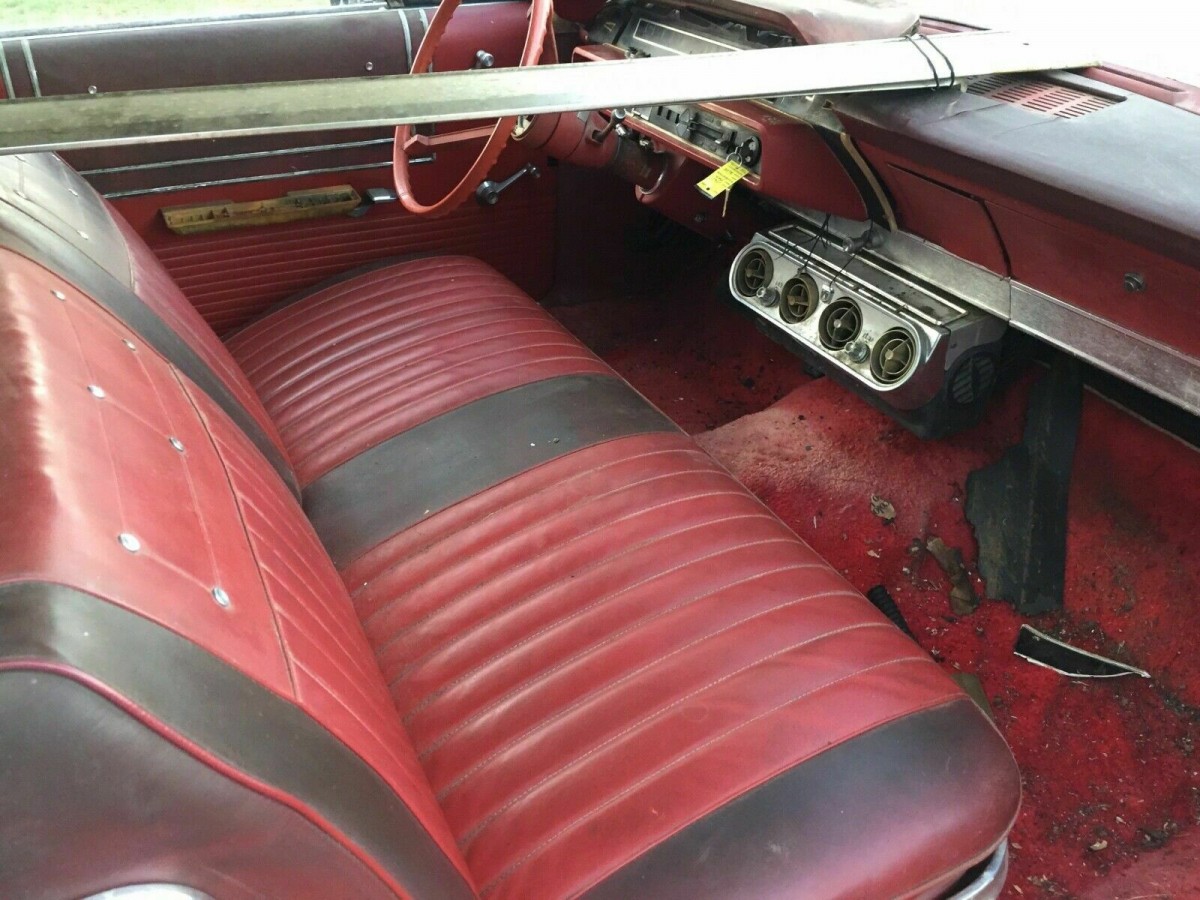 The seller says the Galaxie is a Wisconsin car with the “typical rust.” I don’t know that any rust is typical, but we’re told the floorboards and trunk have some of it to be dealt with while the rest is said to be solid. The convertible top and frame assembly are all there. The Ford has all its glass, and the interior looks good from what we can tell, although the carpeting might be due to be replaced. The Ford even has dealer-installed under-the-dash air conditioning. Is this a car that you would fix up enough to drive and show as original or would you go the whole way and redo it from top to bottom?