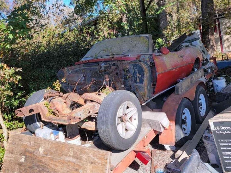 The top is down (or gone), so the interior has been exposed to the elements. Though the trailer the back half of the car rests on is under a cover, it looks to have been there a long time given the stuff accumulated around it. I’d want more details and photos before making a trip to the Carolinas to check it out.