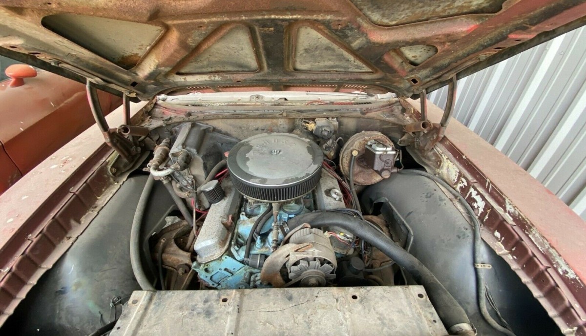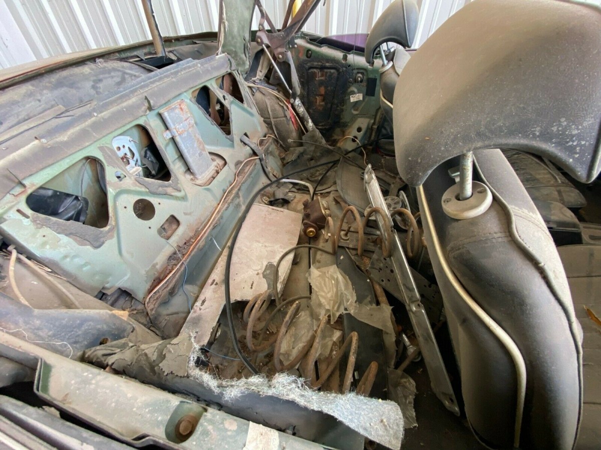 Inside the car, the interior looks somewhat intact though extremely dirty. You’d have to do a deep cleaning to determine what needs to be replaced beyond the material on the bucket seats. And the back seat is missing with that space occupied by trim parts off the car. The dash pad looks good as does the woodgrain material around the instrument cluster and on the console where the Turbo-Hydramatic shifter resides. The seller has not attempted to start the car, so it’s a crapshoot as to whether the current drivetrain is usable.