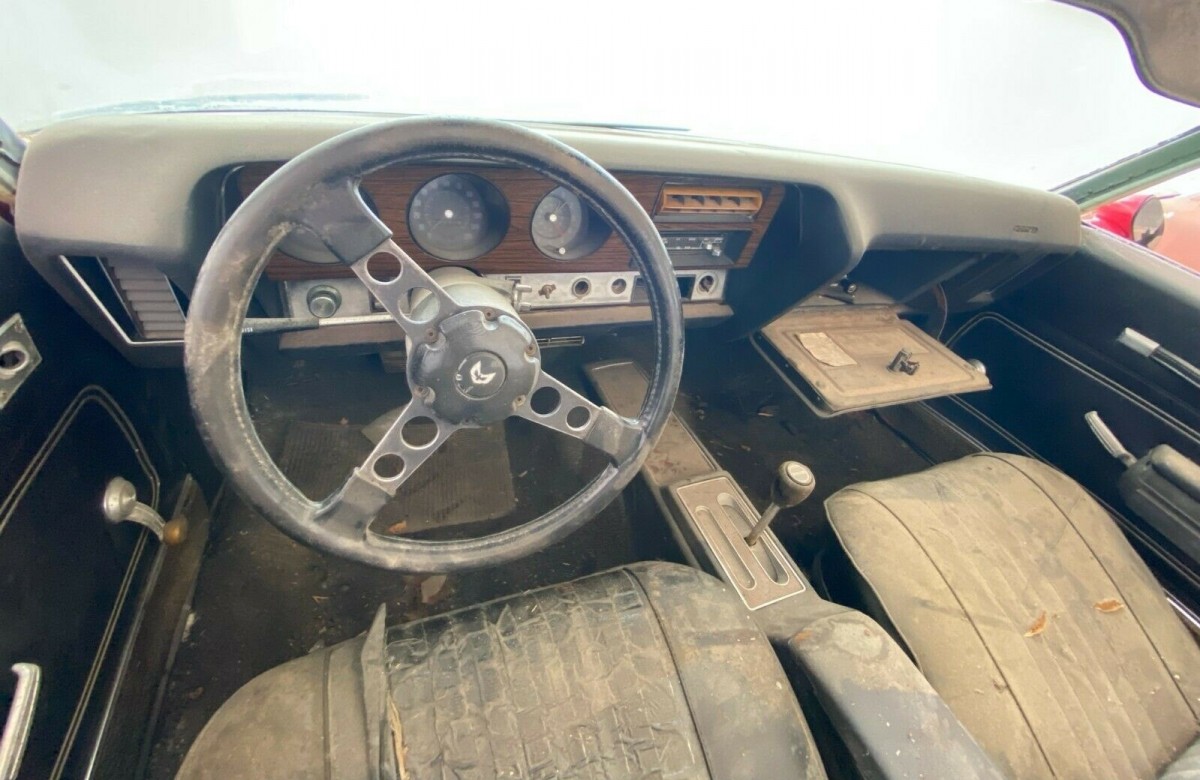 This ’72 LeMans has led a hard life. It took a direct hit in the rear end with the bumper buckled in the middle, yet the trunk lid looks to have escaped unharmed. The red paint is old and faded and there are other dents and dings almost everywhere you look. We’re told the trunk pan has some rust (perhaps due to being exposed from the accident) and we wouldn’t be surprised to find more. The convertible top is a total loss, and we don’t know if the hardware is all there.
