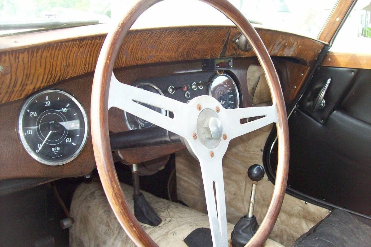 Ref the steering wheel, Les Leston was a racing driver with a line in accessories (like Paddy Hopkirk). Walsall is a town north of Birmingham, so the wheel is either Derrington or Leston, maybe made in but not by Walsall. I have a Leston wheel in a mini which has drilled holes, so think this is more likely to be Derrington, a tuner established before WW2 who also supplied engine parts to Morgan.