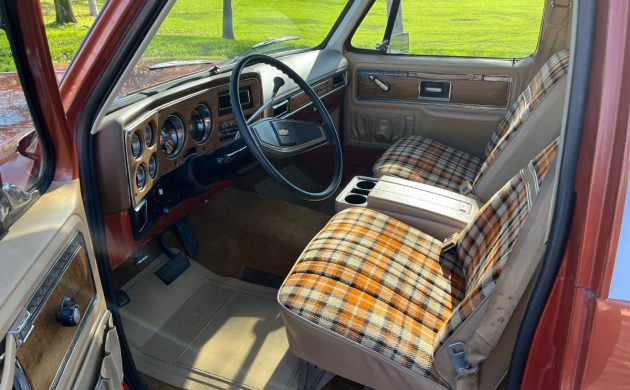 The Cheyenne interior might be the best part of the entire package, because those seats could have come from nowhere else in history but the 1970s. It had full carpeting (including in the rear if the rear seat was ordered, as it was in this truck) and woodgrained trim on the dashboard and door panels. The seller mentions that the upholstery and interior paint are all original.