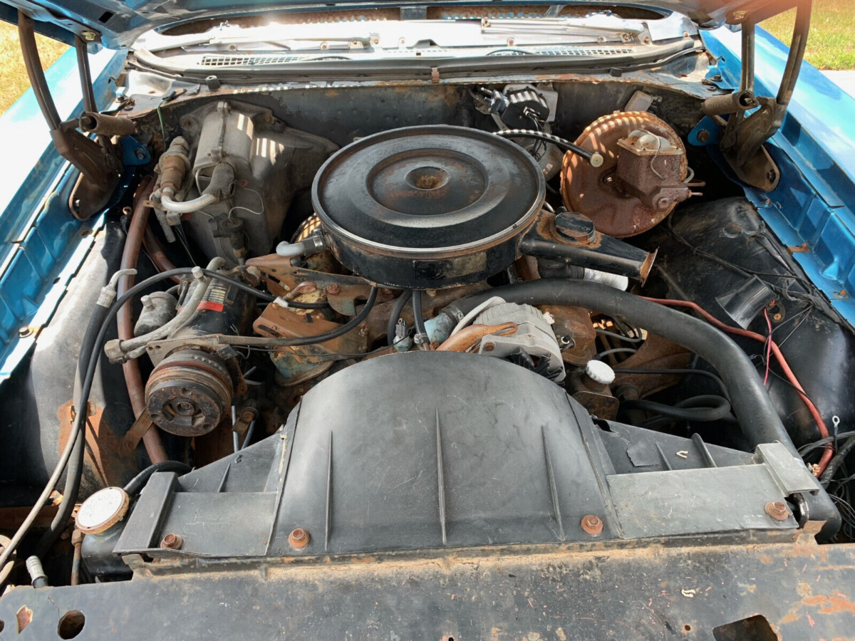 The interior has been stripped except the dash. Pictures in the ad show the floor pans without the seats. The front and rear seats come with the purchase and are installed. There is surface rust throughout the interior and a hole is evident in the driver side floor pan but not near as bad as some cars we have seen. The seller has purchased a convertible GTO and is moving on to that project. He or she originally planned to do an LS swap on this car. It was fairly well equipped from the factory with factory air, power top, air conditioning, power windows, power steering and power brakes.