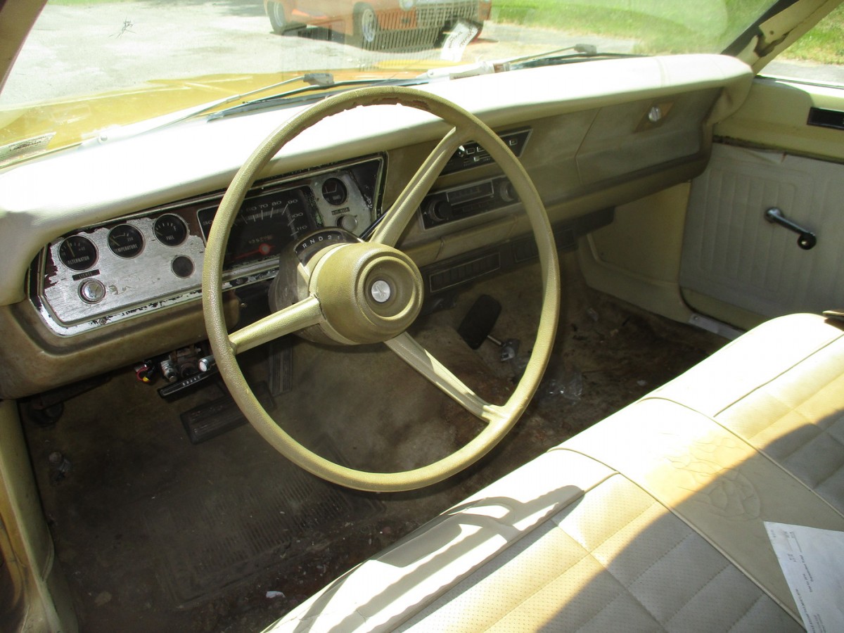 If you look carefully you’ll see the air conditioning vents under the dashboard. Chrysler never modified the dashboard in these cars for air conditioning outlets so the factory system looks like an aftermarket add-on. (Kind of strange since even AMC had AC outlets integrated into the otherwise awful dashboard design of the Hornet and Gremlin.)