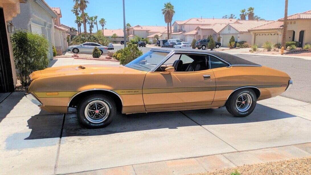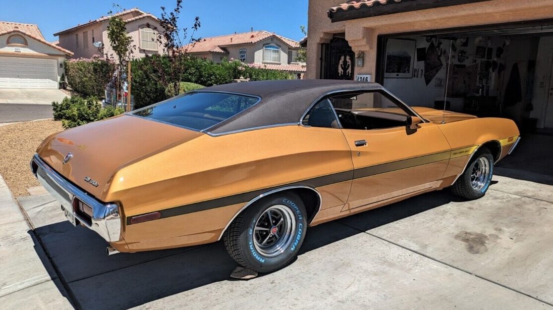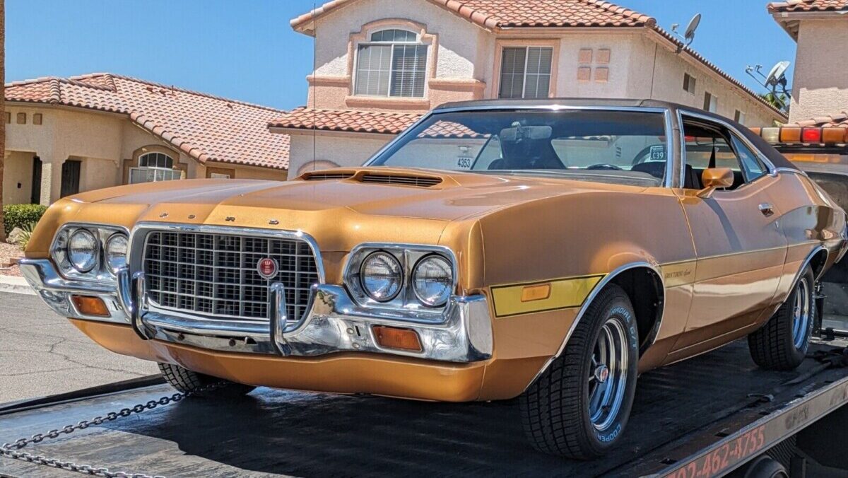Shiny and complete, with documentation and plenty of pictures, this 1972 Ford Gran Torino Sport in Las Vegas, Nevada is not perfect, but it runs and drives, according to the seller, and certainly looks local car-show ready. The sporty classic comes to market here on eBay, where at least eight bidders have the market price above $21,000 without meeting the seller’s Reserve. New seats, tires, and other parts shorten the to-do list for the new owner. The new-for’72 Torino’s prominent center grille opening is one-year-only as safety regulations prompted a more conventional beam bumper for’73 up. A non-original 351 V8 stands in for the car’s factory 429.