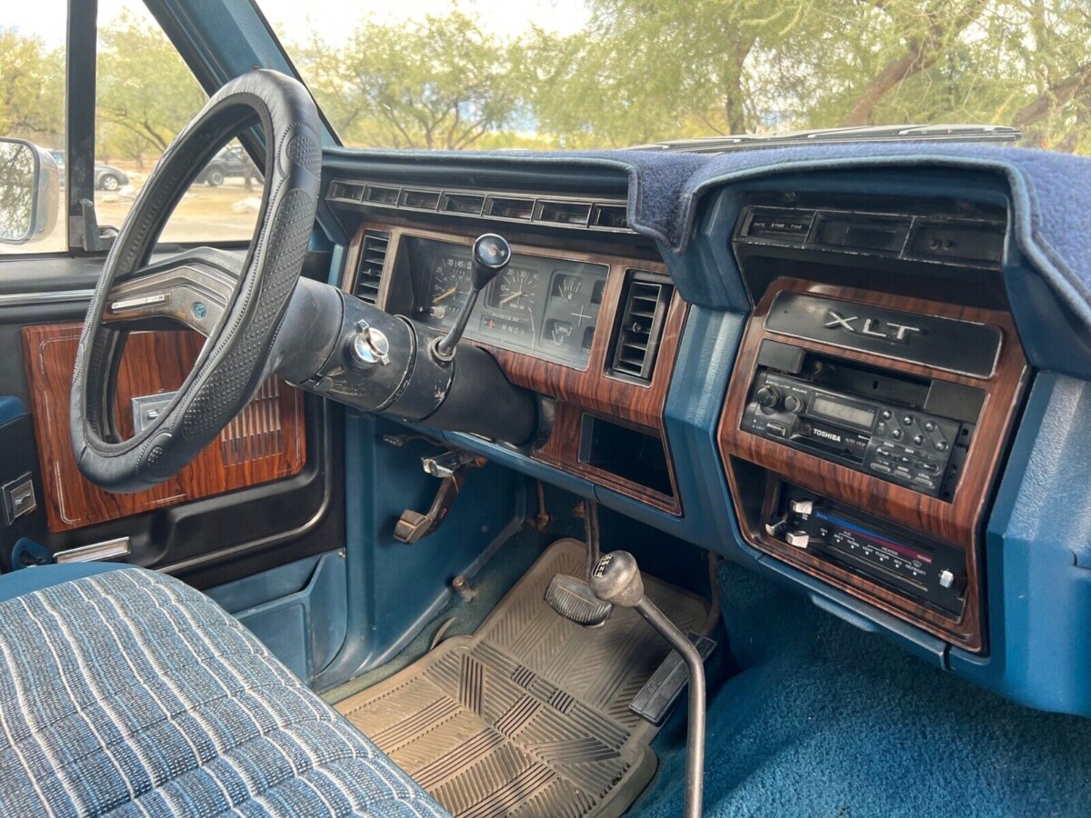 The interior is probably the biggest highlight for this truck, as it’s in seriously nice condition for an unrestored driver. The XLT package likely triggered the factory to install the wood trim kit you see here, which extended not only across the dash and instrument cluster but also to the door panels. In all the Ford Broncos we’ve written up, I can’t recall seeing very many of them with the trim around the door switches, and very rarely does it look as good as it does in this truck. The seat upholstery appears to be original and in very good shape. The seller doesn’t confirm whether there’s a cracked dash pad under that fuzzy cover, but it’s certainly a possibility in a desert truck like this.