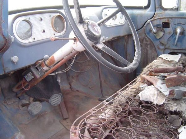 Inside, the seat is in tatters, with very little upholstery left on it; the seat appears to have been upholstered in white or gray. Otherwise, the rest of the interior appears to be solid and complete, and would look cool restored in blue with a gray or white seat. I dig the floor shifter, as well as the column-mounted four-wheel drive system. The engine-turned gauge surround also adds an aggressive look, and reminds me of the gauge cluster surround in a 1970s Pontiac Trans Ams. Though this truck is going to need a full restoration, it is a rare piece of machinery and almost everything is here. I would love to see this truck at a car show or cruise-in. What are your thoughts on this rare V8-equipped W100 Power Wagon?