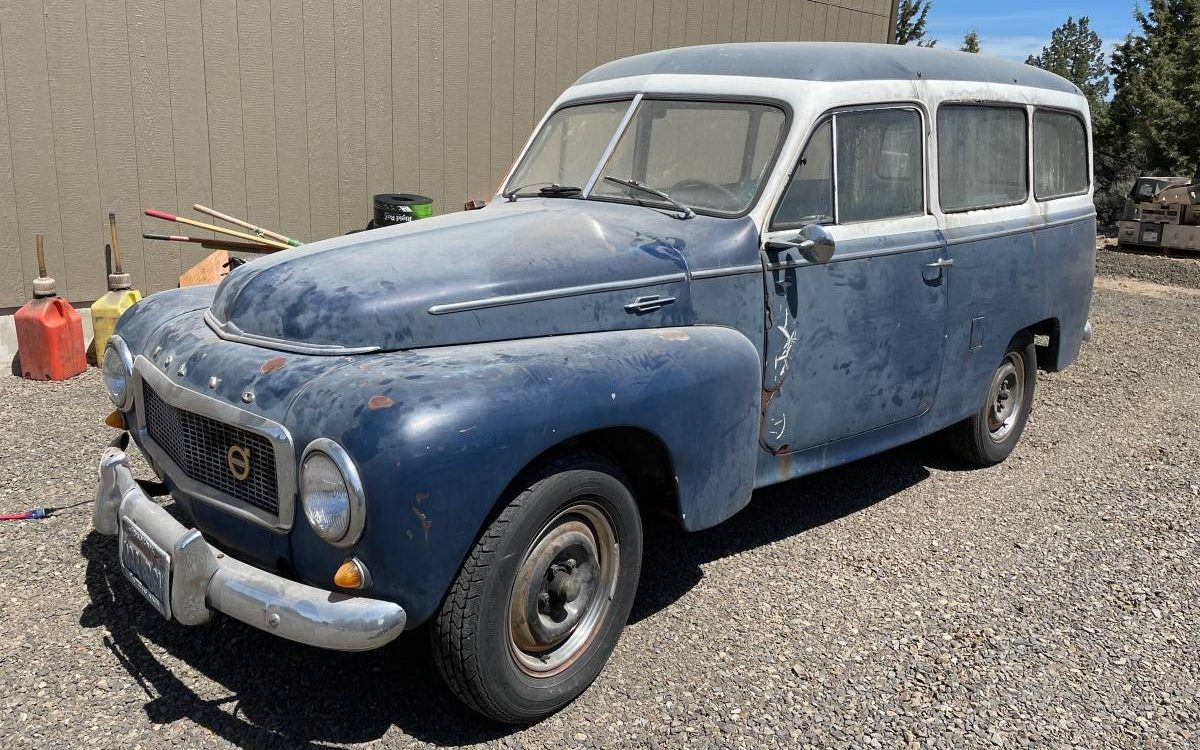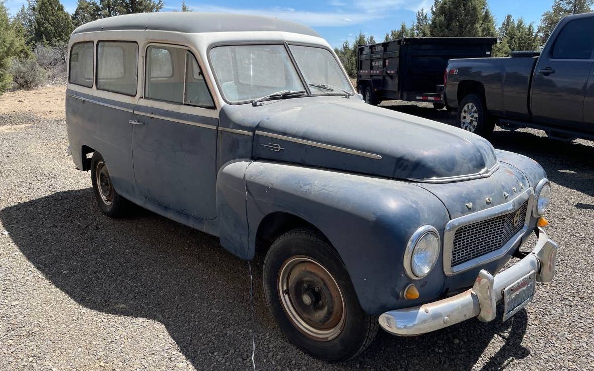 FROM 5/21/2021 – The utilitarian Volvo PV445 Duett is the granddaddy of today’s luxurious Volvo wagons. It was based on the PV445 chassis that was first available in 1949, using the same engine, front suspension, and front sheet metal as the PV444 sedan. Unlike its unibody passenger car counterpart, the PV445 employed a ladder frame with leaf spring rear suspension. This separate body-on-frame construction allowed it to be offered as a bare commercial chassis from the cowl rearward, for commercial and coachbuilt versions, which included both pick-up truck and convertible variants. In 1953, a factory built-wagon was introduced with the name “Duett,” which was intended to signify this vehicle’s dual purpose of hauling goods and people. Few details are given on this 1959 Volvo PV445 Duett available here on Craigslist in Bend, Oregon, but it looks like a solid and complete example. Thanks to Barn Finds reader Gunter Kramer for the tip!