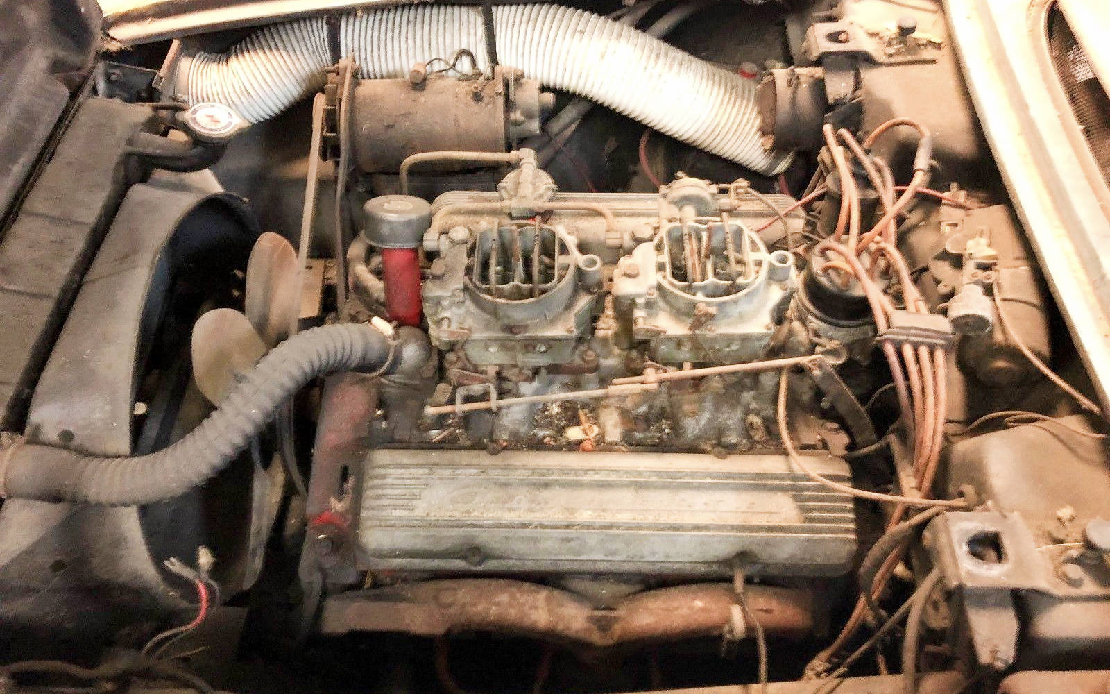 The seller really doesn’t give us much to go off of. They state that it’s a barn find that was last registered in 1975, the bit about the engine and that it’s a 3-speed. Speaking of the engine, here is a close-up view of the 327. The dual four-barrel setup was offered with either 245 or 270 horsepower in 1958, but there’s no word on which version this car had originally. It’s hard to say exactly how much power the 327 is good for with this setup, but it should be plenty of power to have fun with.