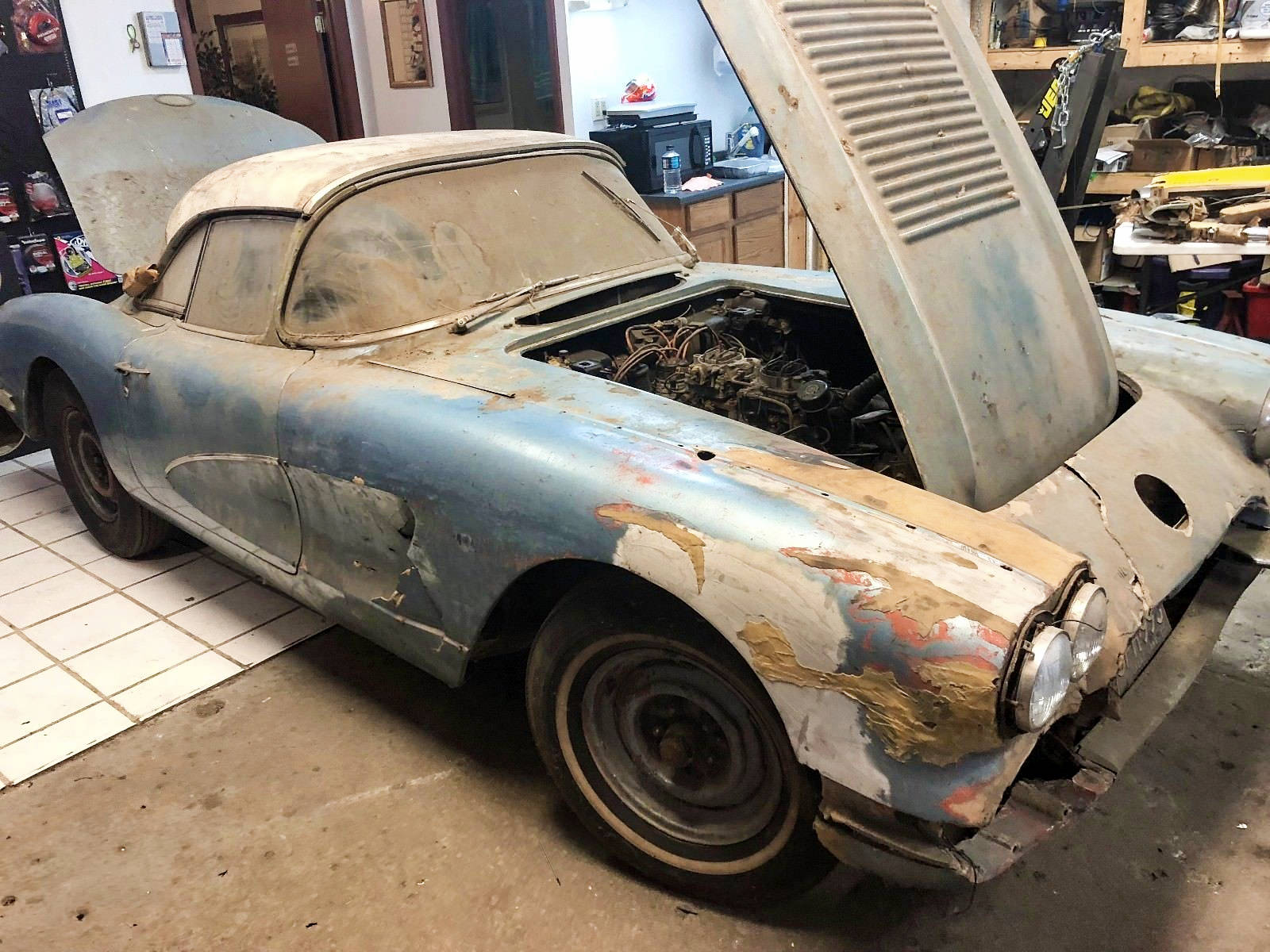 Cool find Josh. 58’s are my least favorite vette. Looks like a small collision put her on the back bench back in the day. I am sure it will look new some what soon. That frame photo reminds of a song, Spooky little girl like you. Whats up with that dizzy. I see some other stuff going on under the hood but I will leave that to the heavy hitters. Take care, Mike.