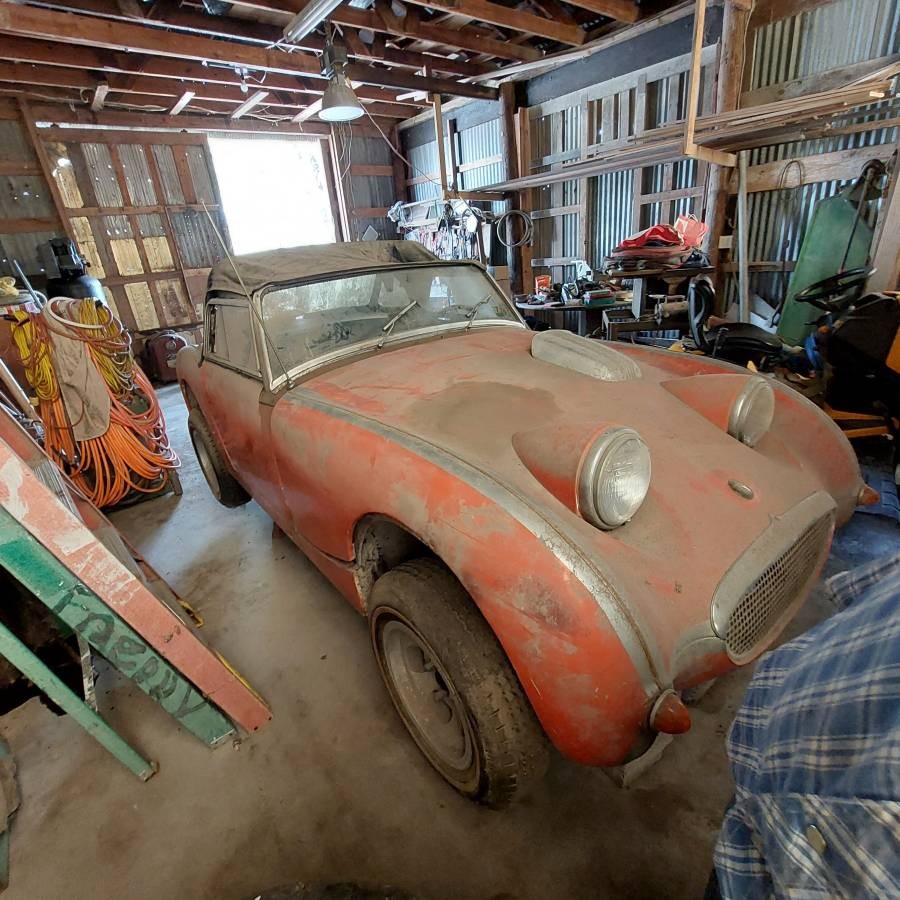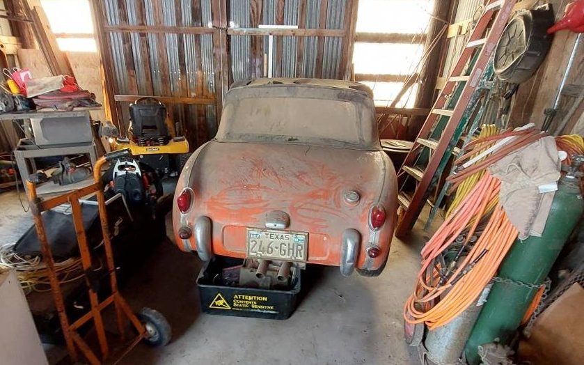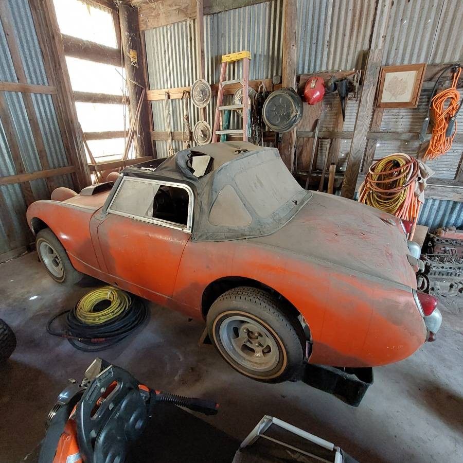 How’s this for basic information? This 1960 Austin-Healey “Bugeye” Sprite has “been in the barn for a long time.” And “it was running when I parked it” but “is not running” now. Of course, “You will need a mechanic to get it going.” Oh yes, there’s a title. The car is here on craigslist in Weslaco, Texas. The owner is asking a mere $4,000 for it. And it could be a bargain. It’s necessary to qualify that, because the photographs—while evocative—are very limited. There are no engine, interior or undercarriage shots. But what can be seen doesn’t look half bad. It’s filthy, of course, but I can’t see any accident damage or rust. The reddish-orange paint might even come back. The mag-style wheels are far from stock but the wheel wells don’t appear to have been cut up. The top is in tatters, but all the trim is there and might shine again. It still has its side curtains. But what is that crude power bulge? It really would be useful to have an engine shot. Note the twin exhaust pipes. The odometer reading is “100.” Let’s assume it’s 100,000.