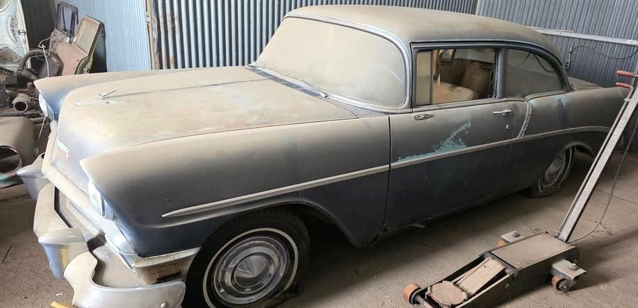 This Chevy was a basic car when new, and it appears a 235 cubic inch inline-6 is under the hood. But it’s been stripped of parts as perhaps it seized up and repairs began when the whole project was mothballed. A 2-speed Powerglide transmission is likely lurking there, too, though the seller says he has an extra along with a 283 V8 with a dual quad intake, which appears to be part of the transaction.