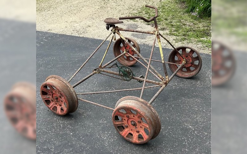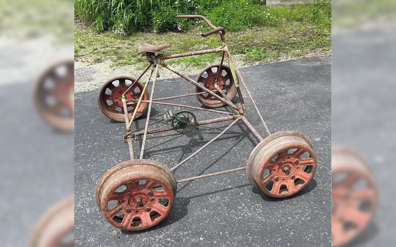 Sold before any of us could consider it. Never mind that I was a bit skeptical of the provenance of this thing–it would be far too easy to just cobble one of them together in welding class once you source the rather common rail wheels, and the wheels seen here in no way match the spoked wheels of the original Teetor carts, more like bicycle spoked wheels than these heavy track cart wheels from maintenance of way flatcars..