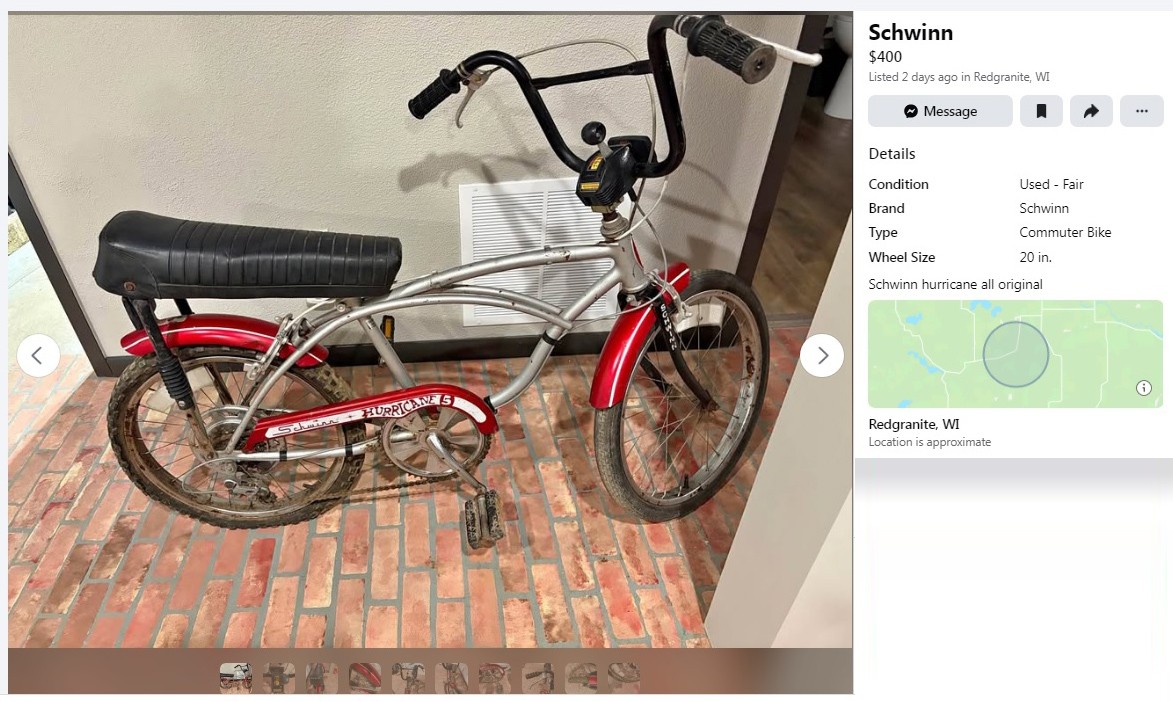 It’s time to think about winter restoration projects for a few million of us who live where it gets cold, snowy, icy, horrible, ridiculous, why-do-I-live-here, wait, where was I going with this? Oh yeah, with three or four months of miserable weather barking at our door right now, it’s time to think about another restoration project. This late-1970s Schwinn Hurricane 5 early BMX-type bike is listed here on Facebook Marketplace in Redgranite, Wisconsin, and they’re asking $400. Here is the original listing, and thanks to Lothar… of the Hill People for the tip!
