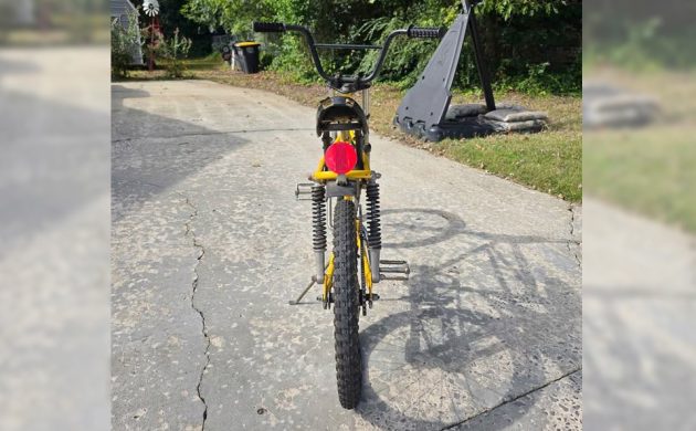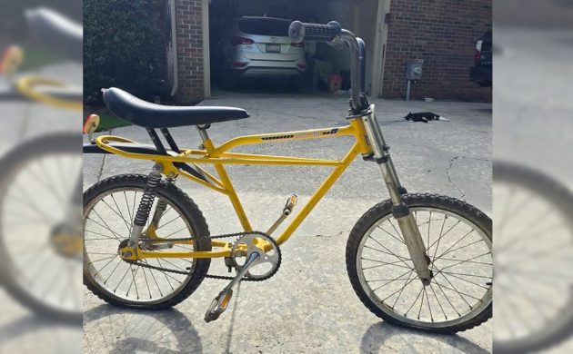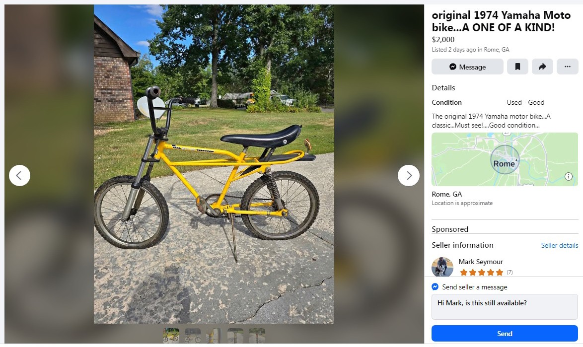 This is something you don’t see every day: a bicycle from a motorcycle manufacturer. The seller has this rare and early BMX-type bike listed as a 1974 model, but those had a solo seat, and the lower forks were painted to match the frame color, either El Toro Orange or Competition Yellow in this case. This unusual and rare 1976 Yamaha Moto-Bike is listed here on Facebook Marketplace in Rome, Georgia, and the seller is asking $2,000! Here is the original listing, and thanks to PRA4SNW for the tip!
