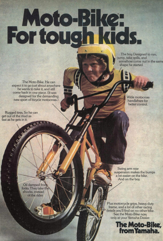 Bicycle MX,,,pfft, as macho motorized MX riders, we teased these kids, what, mommy won’t let you have a real MX bike? ( my parents didn’t either, but I didn’t listen to them)Truth was, one could get equally as hurt on these, and most, if not all eventually graduated to a motor. These did give a great introduction to the world of dirt bikes, and were excellent riders, thanks in part to these early on. Yamaha marketing genius at work here. They knew full well, to get a kid on a bike early on, meant soaring profits later on. And it worked, Yamaha was the #1 selling dirt bike for years, and probably still is.