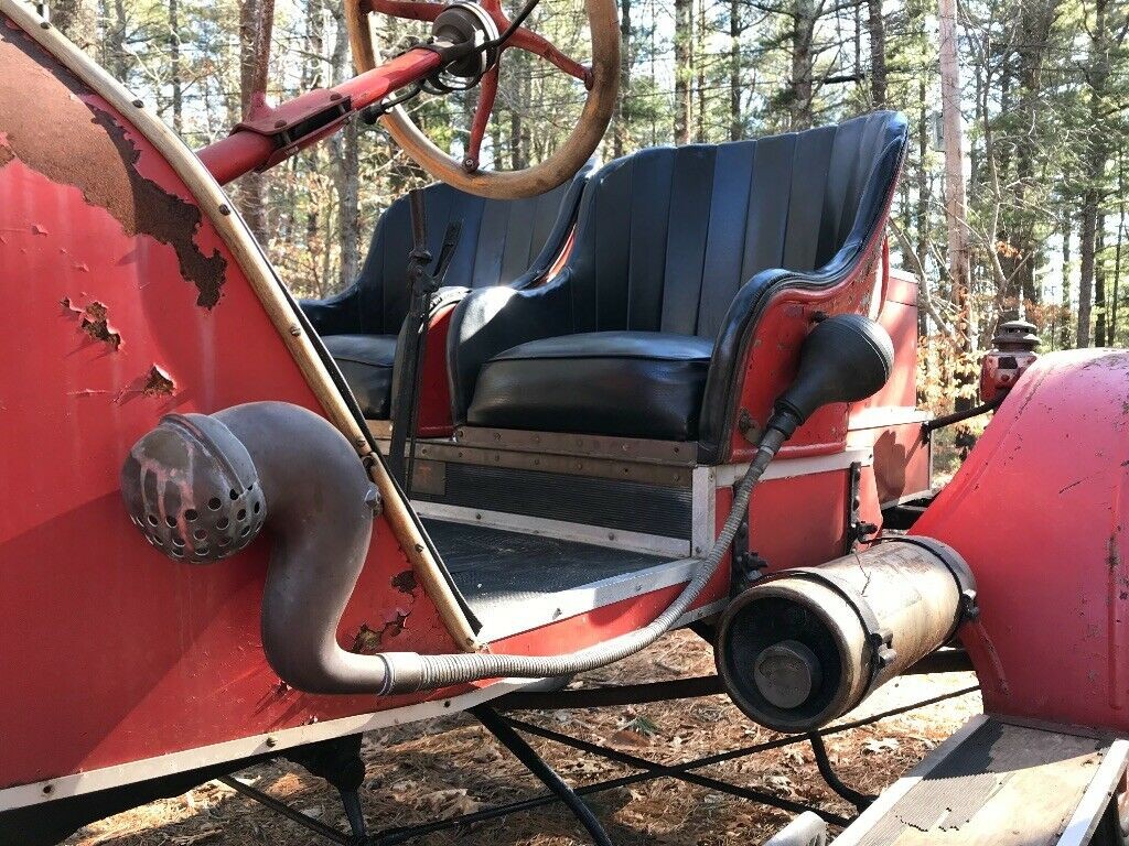 Predating roof-mounted lightbars, or even a roof for that matter, this fire company “apparatus” (to use an industry term) came with quite a few bells and whistles for its time. There’s a multidirectional dash mounted brass spotlight and a monocle windshield that offered the chief semi-protection against driving rain, sleet, wind, and insect-to-face collisions. The seller claims the car was restored in 1951 to its original red paint scheme with gold leaf trim, much of which is now cracking and peeling. The fenders look solid and all of the brass components, including the headlamps and honeycomb style radiator with Ford emblem, show oxidation but fortunately very little corrosion. The wooden spoke wheels are in amazing condition but the steering wheel, although solid, is heavily faded.