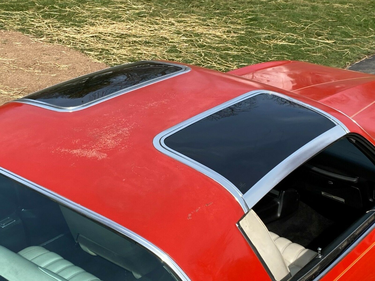 As you can see above, the Hurst Hatch T-Tops were smaller than the later GM T-Tops. These look in nice shape but the original paint on the car is starting to weather and fade. The seller states that this is a California car so it is equipped with an Oldsmobile 350 cubic inch V8 engine. This was probably the same engine that came in the Oldsmobile Cutlass and was rated around 170 horsepower. The engine is backed by a Turbo 350 automatic transmission.
