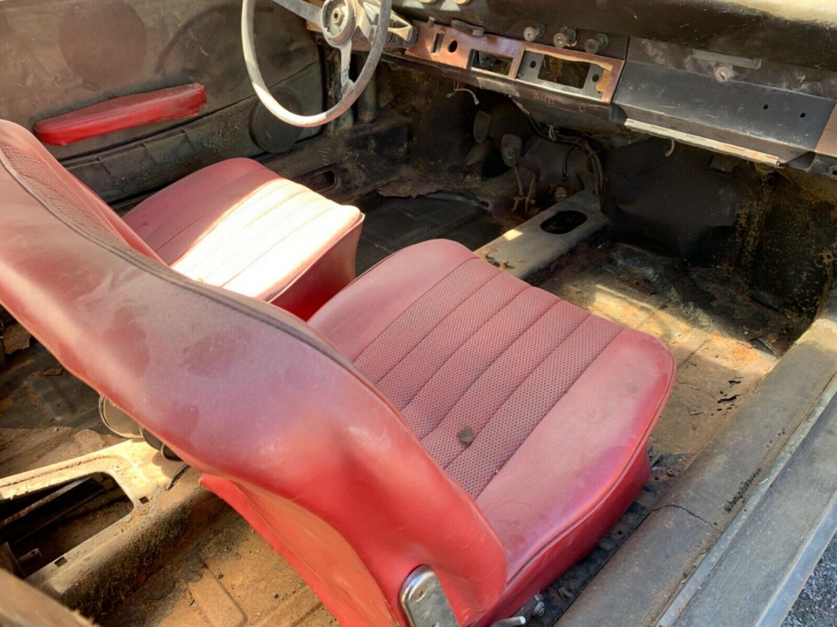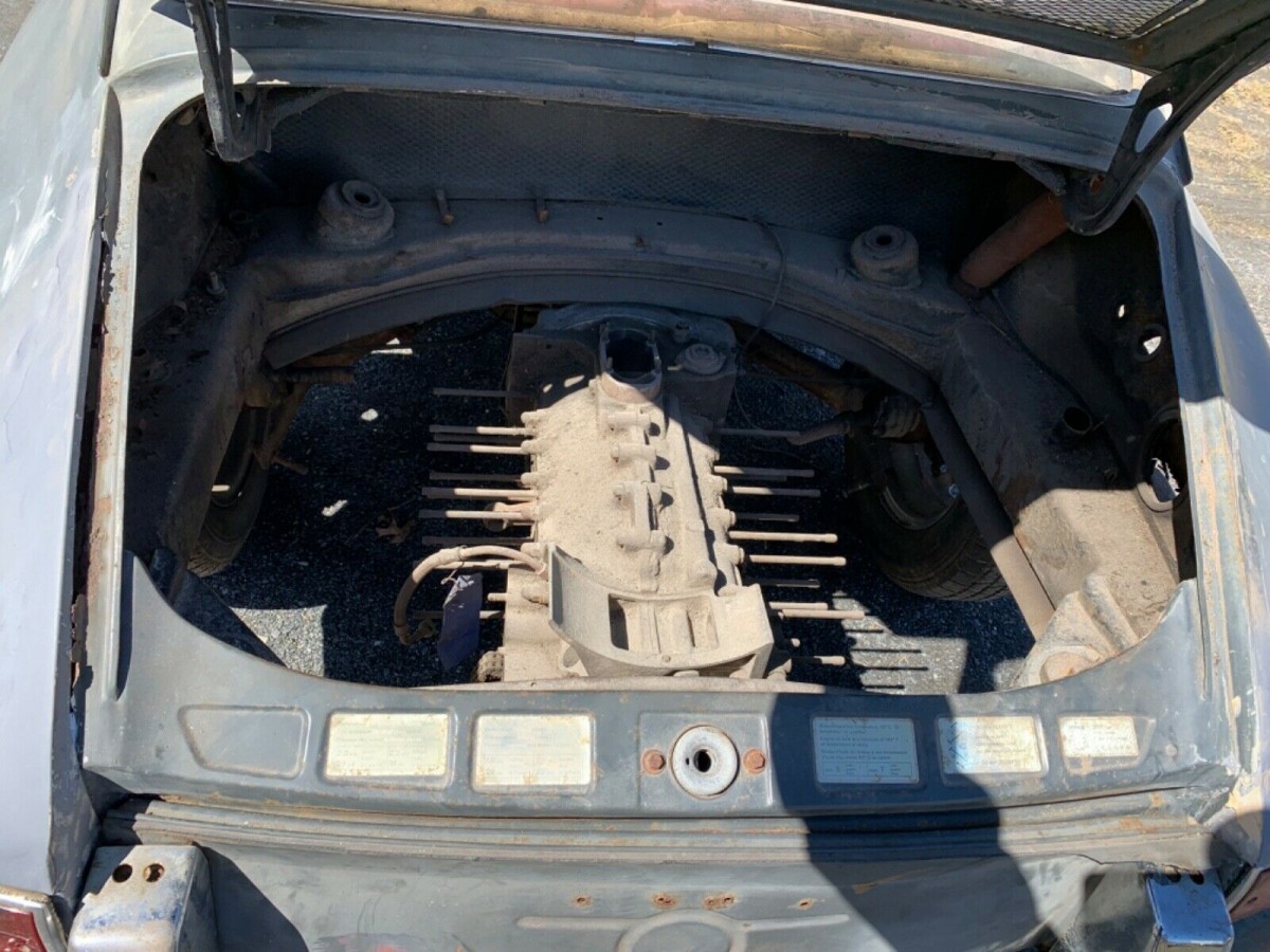 All that aside, the color combination really is tough to beat. A steely battleship gray paint job with lipstick red seats and door panels is a very attractive combination, and despite how incomplete the 911 is, the interior is in surprisingly good shape. Like many of these early air-cooled cars, the floors need work and the listing notes the floors are simply screwed in for shipping purposes. The seller notes the primary areas of rust concern are the floors and inner and outer rockers, which is fairly typical for a project-grade long hood model like this. The dash retains gauges and some switches, but that’s about it.