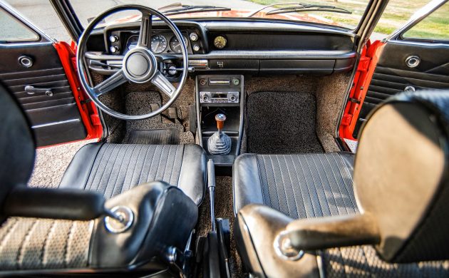 Basketweave upholstery and salt-and-pepper carpeting look original (or original style) and well kept. A crack in the dashboard afflicts nearly all 2002s, and this is no exception. Only the tii got the clock in the dash center, which makes a distinctive noise you can enjoy while waiting for that special someone. A simple four-speed with no overdrive sends power to the independently suspended rear wheels.