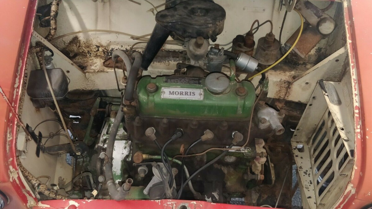 Under the hood sits the original 848-cc BMC A-Series engine, fed by a single SU carburetor. Though it has not been started, it is said to turn freely by hand. There is no mention of the side-mounted radiator and cooling fan which are both missing. A potential buyer would want to check to see if this and other parts are included in the sale.