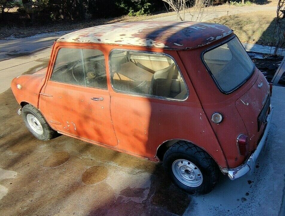 This early Mini is believed to have last run in the late 1980s and has spent the past year and a half sitting in a climate-controlled garage in Texas. Before that, it sat in a garage in Denver after being pulled out of a barn in South Dakota. Though not rust-free, the body is in solid condition for a more than 60-year-old British car, the worst areas being some scaly rust on the floors and perforation in the front wheel wells. Though now finished in a faded red, there is plenty of evidence of the original Old English White that it wore when it rolled off the production line on January 27, 1960, as per the included heritage certificate. The body and engine numbers also match this documentation and photos of the tags and stampings are included. Tires appear to be new as they still have stickers on them.