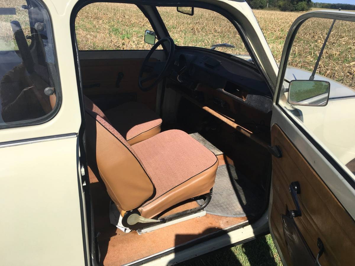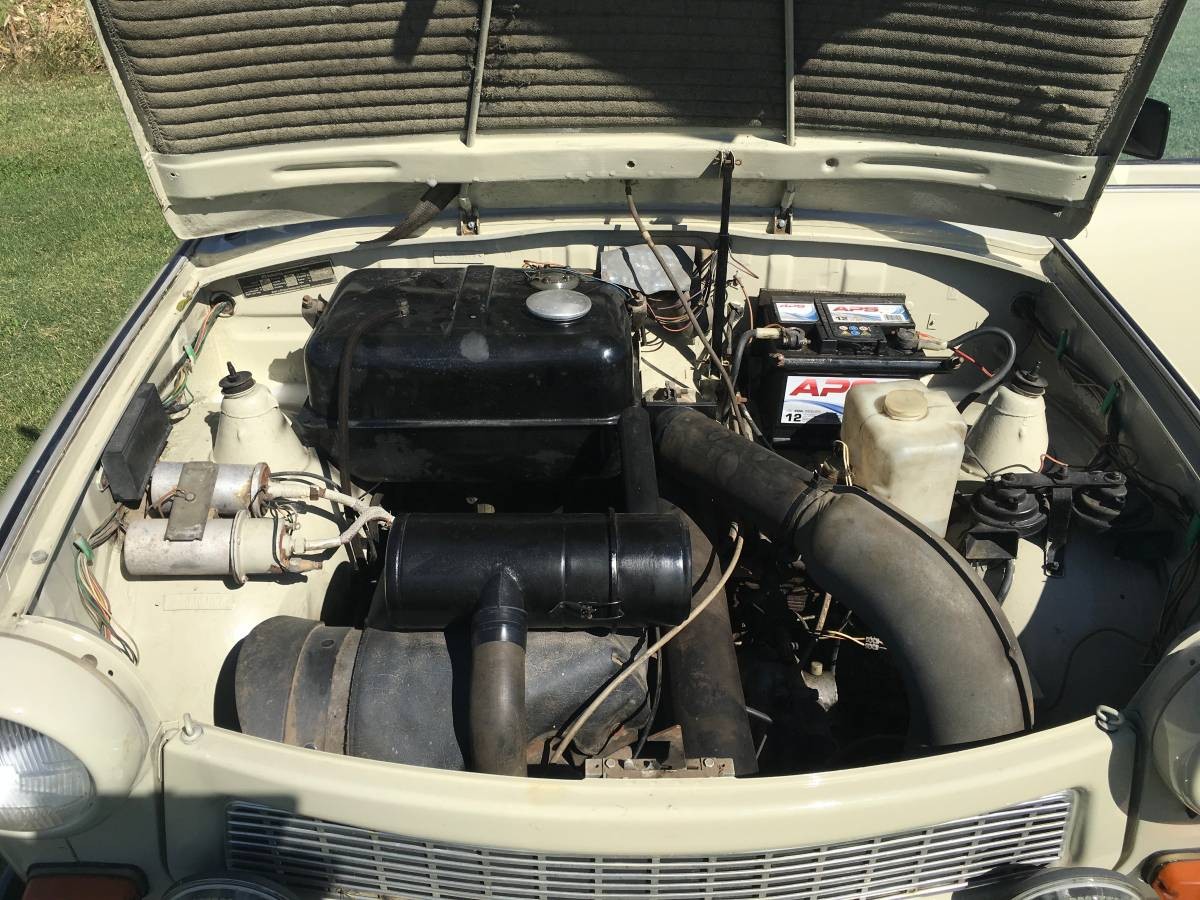 The Trabant 601 was in production from 1963 until 1990, and it remained virtually unchanged throughout its life. When it was introduced it was actually considered to have some quite advanced engineering, being a front-wheel drive car. The transmission is a 4-speed manual, while the engine is a 594cc 2-cylinder 2-stroke air-cooled engine which produces 26hp. It’s a bit hard to see the engine, as it is obscured by the gas tank. Yes, the gas tank sits directly above the engine. I can’t see any possible problems with that. After all, motorcycles have been doing the same thing for years. This Trabant is a low mileage model, and the engine bay does look nice and clean. The owner says that the car has recently been fitted with new tires and new brakes.