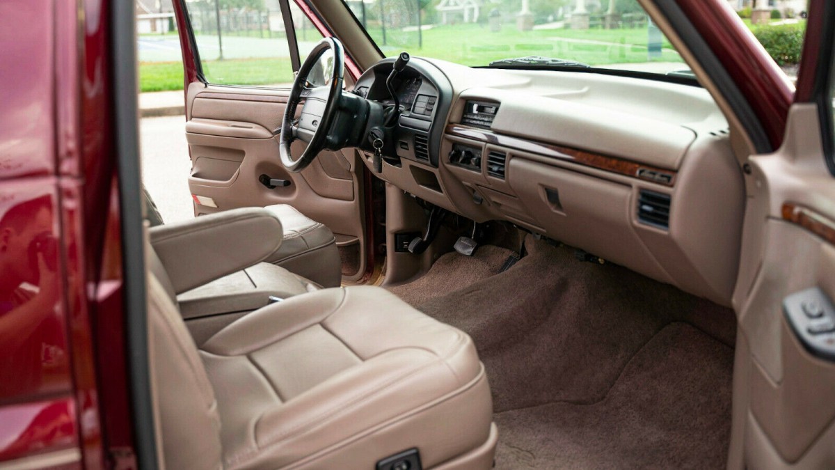 The other bonus to the Eddie Bauers was that they were luxurious inside, with leather seating surfaces, woodgrain trim, and unique badges throughout. The Bronco’s interior is in excellent shape, surprisingly nice for a truck with average miles on the clock. The interior sports bucket seats with a generous center console, and the backseat looks like it was never used. The seat folds flat into the rear storage area floor, which appears to have never carried a bag of mulch. Tan isn’t very forgiving when it comes to hiding flaws, so the fact that the Bronco still looks so clean inside is a testament to the previous owners that have looked after it.