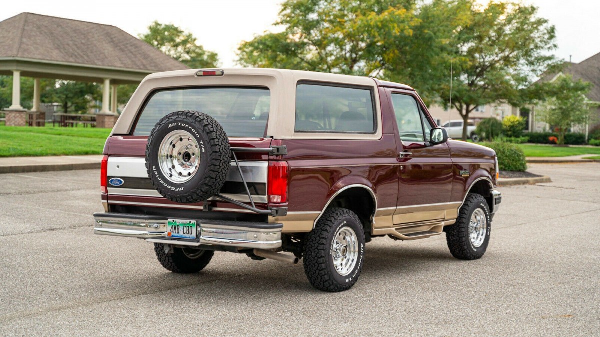 The Bronco sports new tires, which the seller notes are new BF Goodrich All-Terrain K02s with less than 10 miles on them. The seller has restrained from putting a larger set of wheels and tires on the Bronco, and although I think these trucks look good with some lower offset wheels, simply going for a meatier treat gives the Bronco more presence without altering its stock appearance. The wheels look quite sharp with excellent chrome, and the same goes for the front and rear bumpers. The two-tone paint job was a stable of the Eddie Bauer editions, and the finish appears to be in excellent condition.
