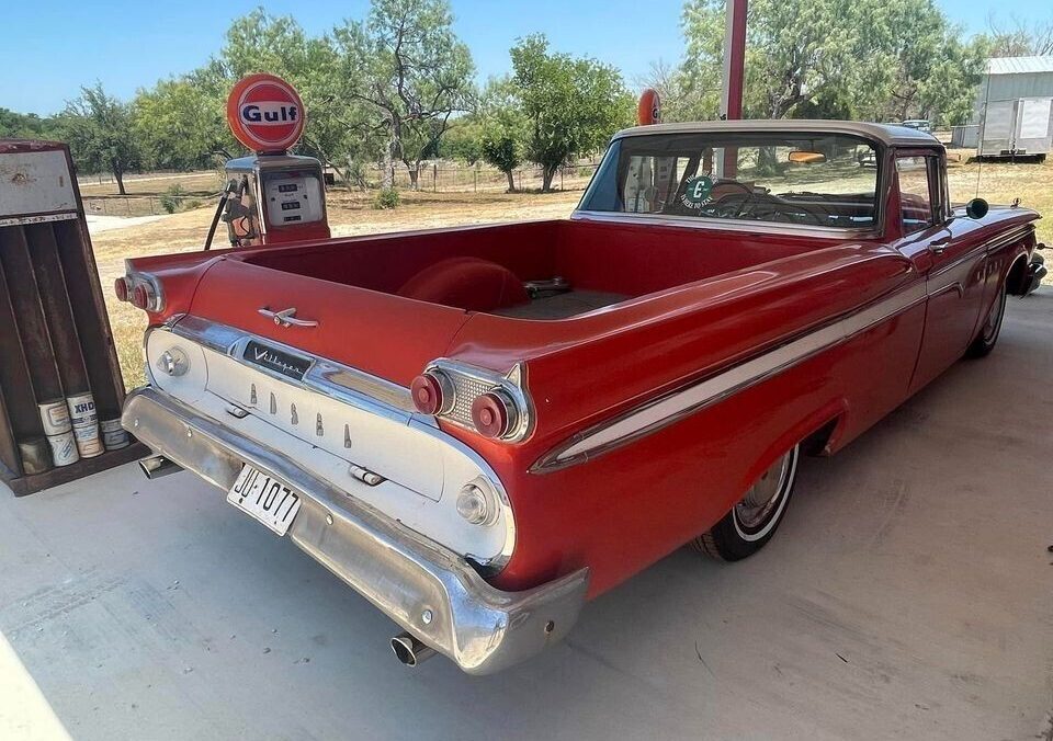 The President Red paint is presentable and shiny and I’m not seeing any bumps, bruises, or scratches. The tasteful side spear trim, roof top, and tailgate cove are accented in Snow White. The chrome, trim, and most of the glass (the seller says there’s a crack in the driver’s door glass, but a spare crack-free glass is included) look good. The rear glass is larger than the flat glass seen on ’59 Ford Rancheros as the customizers repurposed the Villagers curved rear glass. The full wheel covers look very good but I would spring for some period-correct whitewall tires. I’m not spotting any major rust, but I’d check out the driver’s side rocker panel.