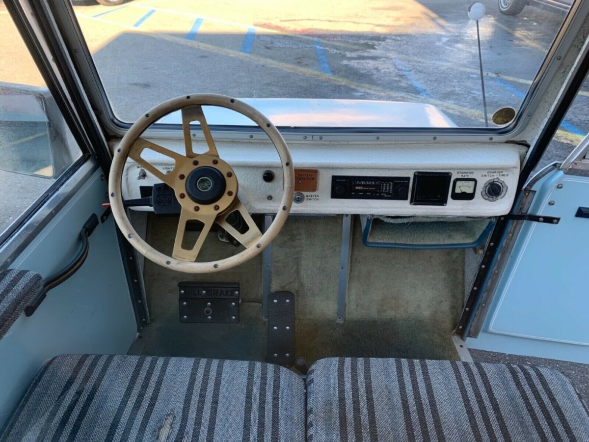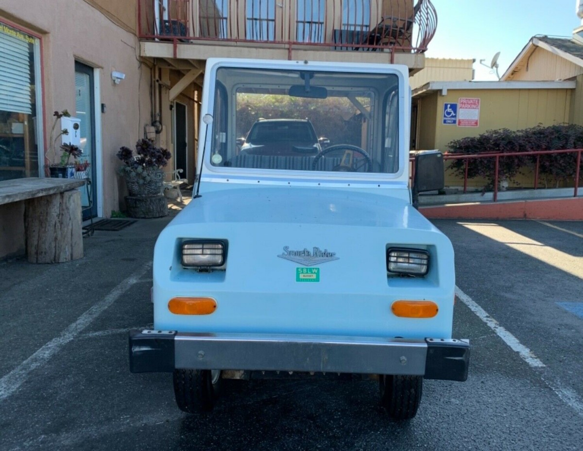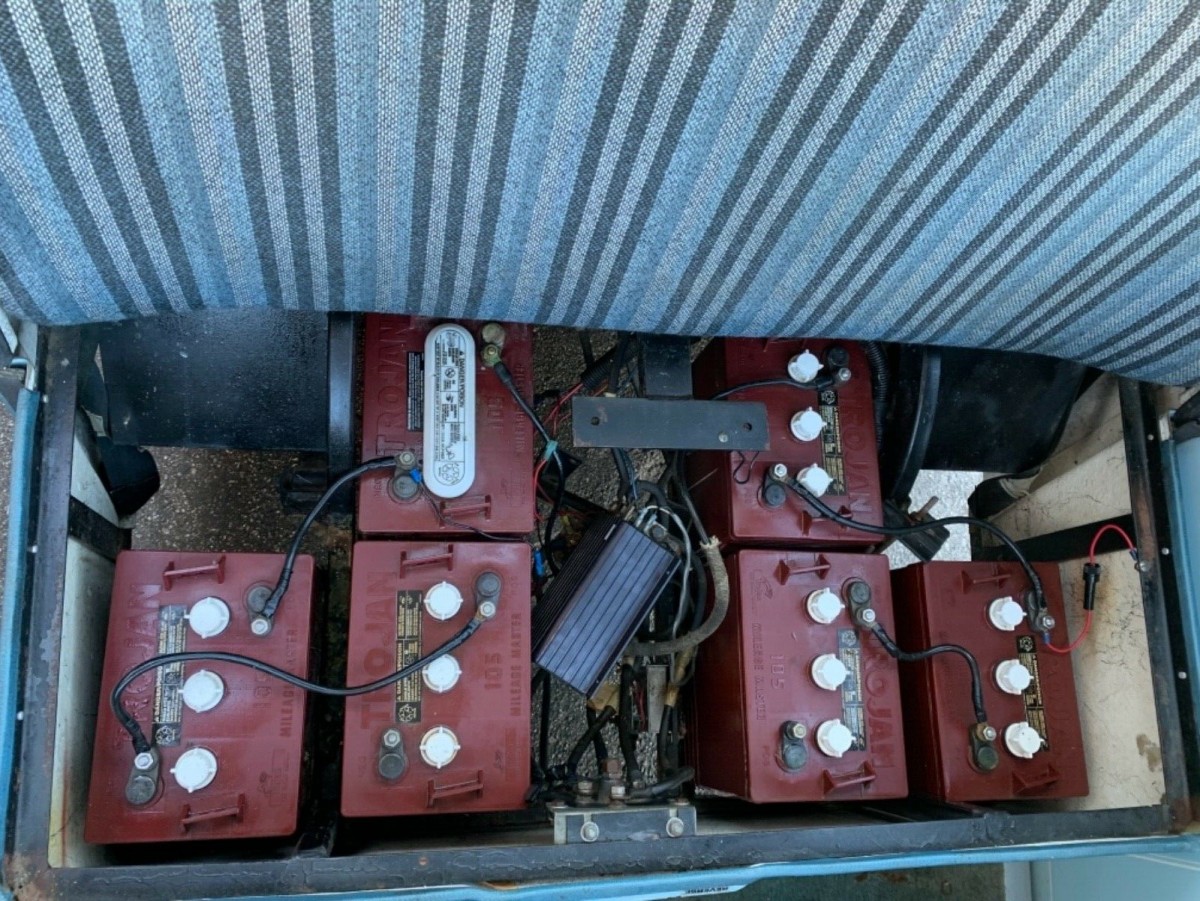 The cars operated off a 36-volt electrical system requiring six batteries. In the technical sense, they were cars with the kinds of features you would expect in an automobile, i.e., a hard top, bumpers, steering wheel, turn signals, horn and rear-view mirrors. But they looked like enclosed golf carts and we’re guessing the body is made of fiberglass.