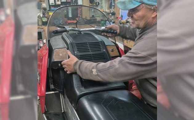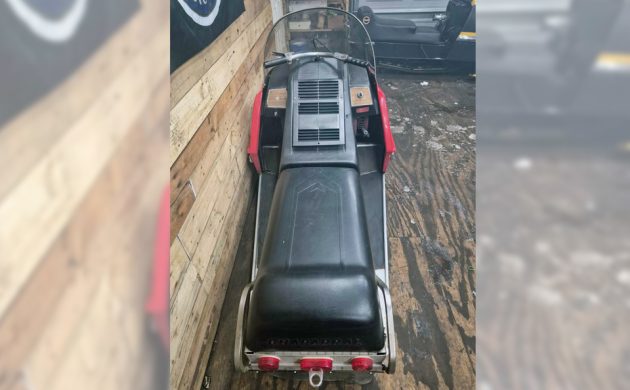 They don’t show a photo of the engine, but here’s a screenshot of the little (vertical!) video they provided showing it being started with the little button on the left side of he cowling. They say this is the Hirth engine, which should be a 438-cc twin-cylinder with around 38 horsepower. You can hear the sweet sound of it starting and idling in the listing. At $625, this is a good deal for such a nice-looking snowmobile, and Chaparrals aren’t something you’ll see a lot of at vintage snowmobile shows. Have any of you owned one?