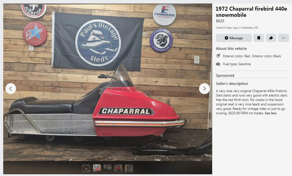 Vintage snowmobiles have to take off in the collector market fairly soon, don’t they? As vintage cars and trucks continue to be priced at crazy numbers, getting a vintage snowmobile this nice for under a grand has to be a deal. This 1972 Chaparral Firebird 440 with electric start is listed here on Facebook Marketplace in Kalkaska, MI, and the seller is asking $625. Here is the original listing, and thanks to Lothar… of the Hill People for the tip!