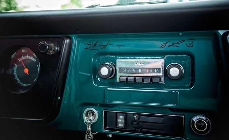 Restoration efforts on the pickup began about four years ago. The bed was removed for the project, but the cab was not. The initiative uncovered multiple colors on the GMC, so it was in the paint shop on several occasions. The photos depict a truck that is now straight and rust-free with a fair amount of documentation to support the storyline. If you check out the dashboard, you’ll see that it was signed by Blake Shelton and Jay Leno (Gwen wasn’t available?).