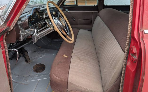 The interior, which appears to be original, is in pretty fair condition. The driver’s side of the front bench seat is stained, and there is some material degradation, but the entire environment is in better shape than I would have guessed. The lack of carpet validates the seller’s claim about the floor pan, and the chrome-enhanced instrument panel is perfectly representative of a car from this era – it’s an attention getter!