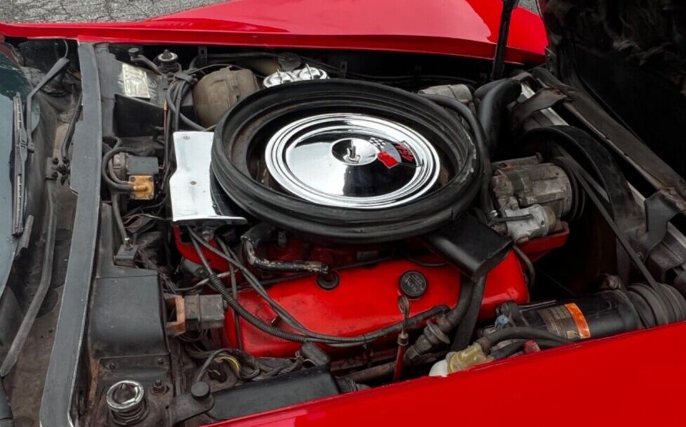 Inside, initially presents well but we’re told that the upholstery contains splits and there are some sort of red seat covers adorning the seat backs. This is an A/C equipped car but there’s no word regarding operability. Of note, the seller mentions, “WHEN YOU START THE CAR THE HEADLIGHTS COME UP, IF YOU WANT THEM DOWN THEY WILL GO DOWN EASILY BY HAND“. Can’t explain that one. Finally, being a 1974 model means that this Corvette was saddled with another safety intrusion, that being a one-year-only seatbelt interlocking system. If you didn’t buckle up, the car wouldn’t start. I can’t tell you how many of these systems I disconnected while working at a Chevy store in ’74. It was a real hassle when you wanted to reach inside and start the engine as you were working under the hood. Fortunately that “feature” was dead for ’75.