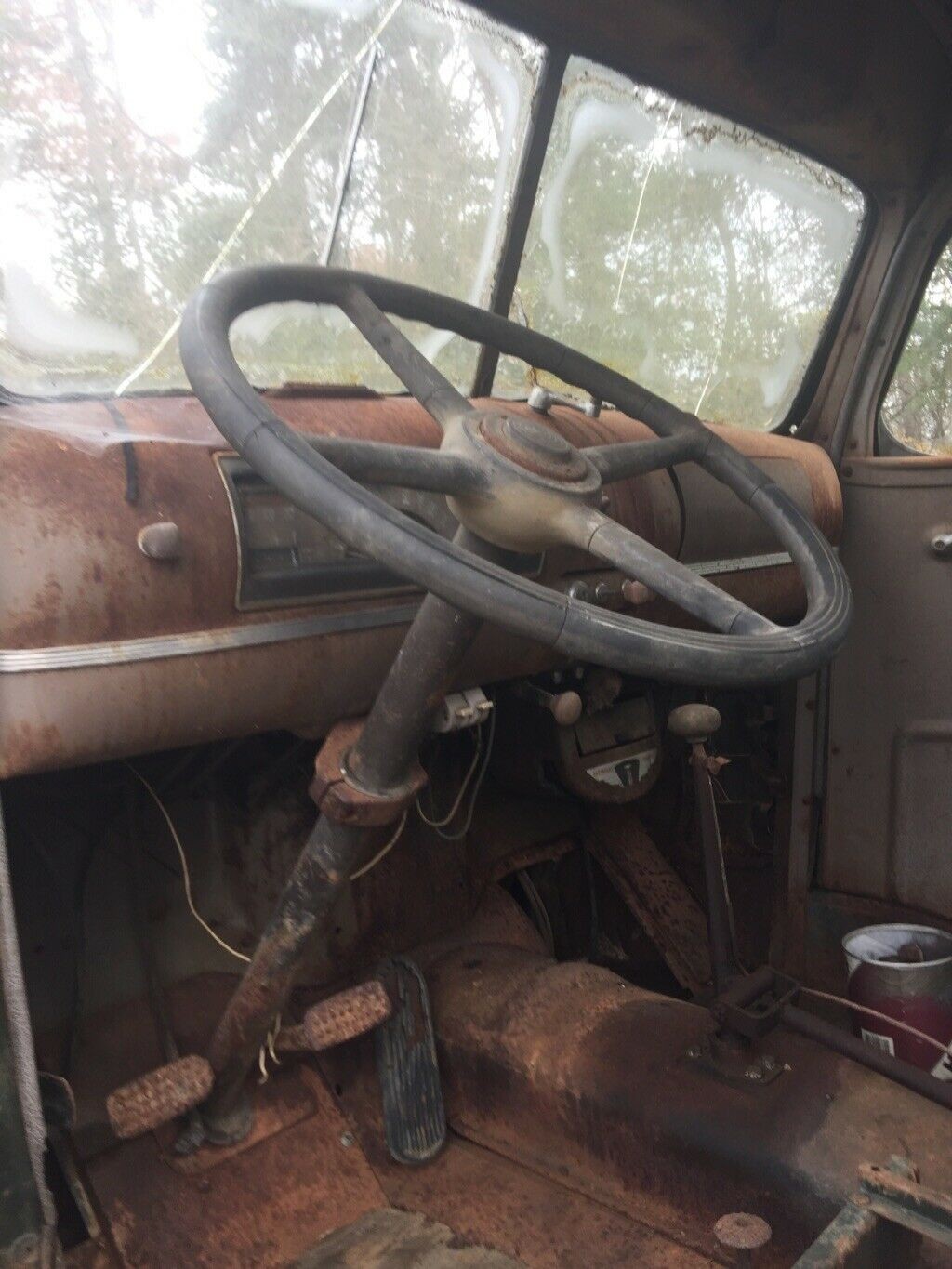 Inside the truck, there is surface rust all throughout the floor boards, but otherwise, it isn’t in that bad of condition. The seller does make a note that there is some rust building up near the inside of the cab where the windshield wipers are located. You can see that the glass all seems to be there and in good condition. Another note they make is that the original split rims do come with the truck.