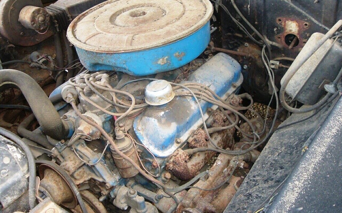 Engine number three! A 1966 Ford 289 cid (4.7L) V8 and three speed C4 automatic transmission (running condition unknown) should suit the car well if sorted out. Rust spots include bottom of radiator support, spare tire well, and a bubbled right fender.