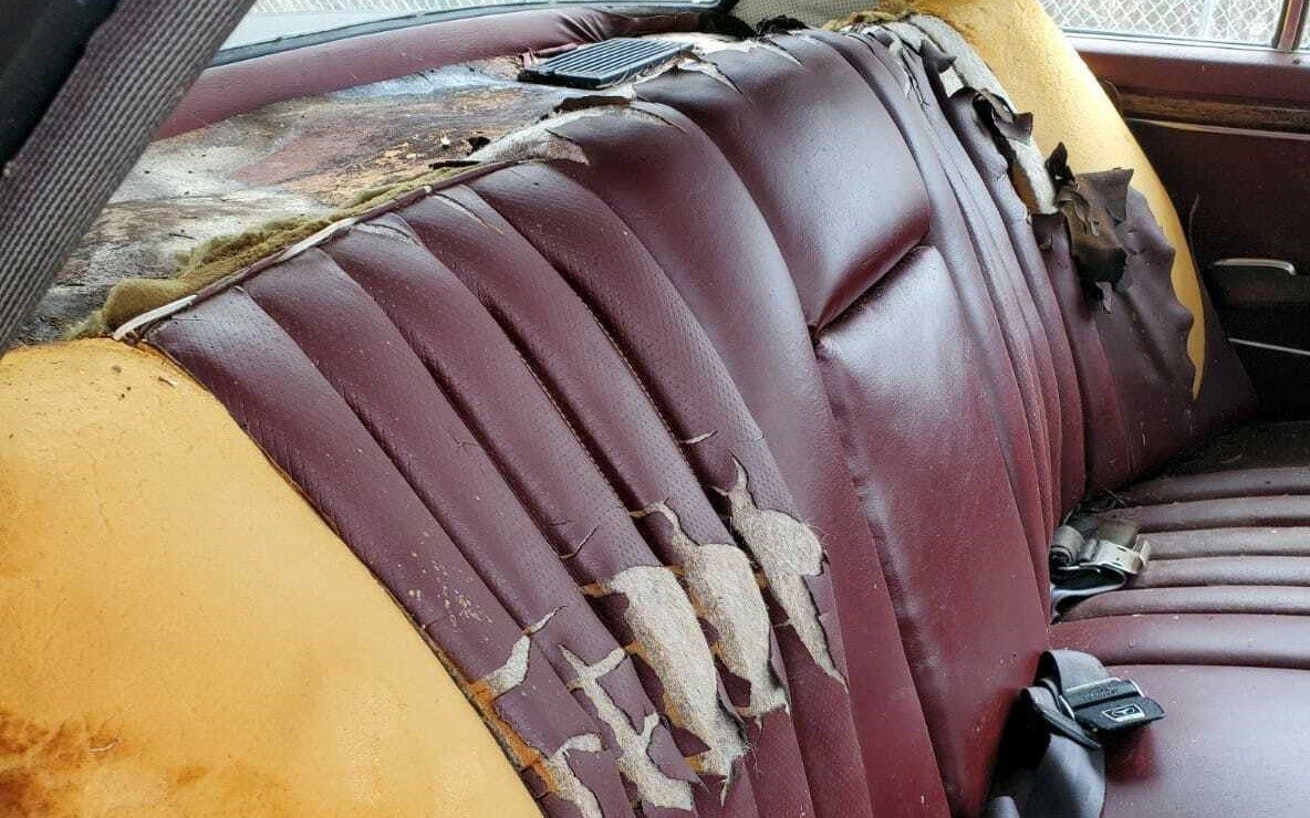 The interior is an interesting study, the front seats are in fair shape, but the red vinyl of the rear seat backrest is a decomposing mess. Looking at the package tray, it appears that water intrusion could be the culprit.