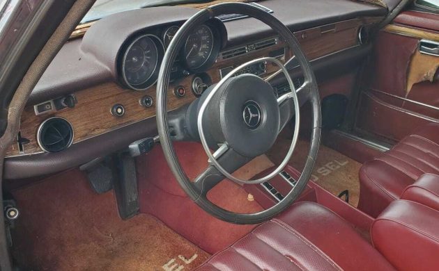 This Mercedes is a bit worn around the edges. The finish is showing degradation but it appears that a clear coat is starting to break down, perhaps a later day two-stage repaint that is giving it up? Or maybe it’s just general oxidization. There is surface rust, and more, that is blooming in the fender legs and lower door edges too. That said, the heavy coachwork of this Benz is still straight and the attachments, i.e. grille, stainless window trim, and bumpers present well. There are no underside images included so that’s an area that should be checked for potential rot even though the seller claims, “Solid rockers with good floors“.