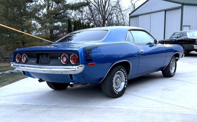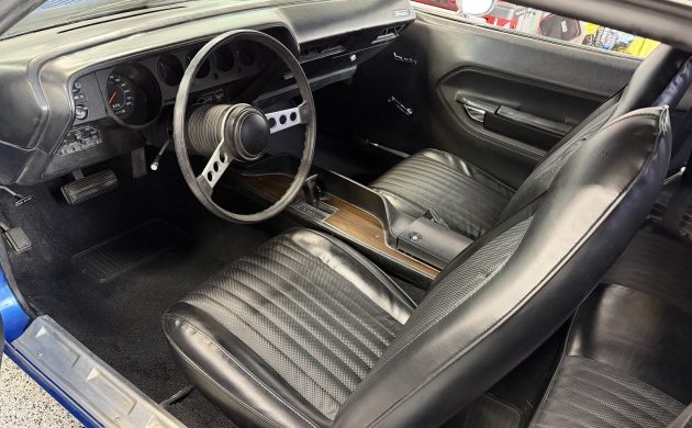 There wasn’t much to differentiate the 1973 Barracuda from the 1974. The latter came with large rubber bumperettes for enhanced safety reasons, but they have been removed from the seller’s car. The sheet metal here all seems to be original and rust-free, but the B5 Bright Blue paint has surely been redone (and well). The black bucket seat interior looks as good as it did decades and 71,000 miles ago.