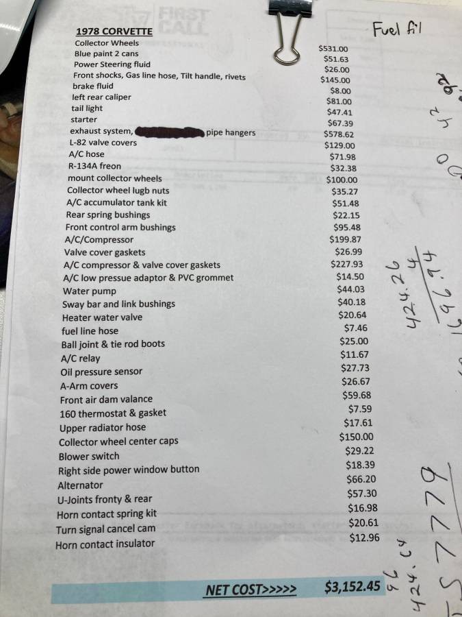 This is where the current owner of this 1978 Corvette is. The story in the ad, which can be a bit hard to interpret, is that this car was purchased from someone who spent a lot of money going through this Corvette to get it as right as possible without going through the expense and trouble of a full restoration. The picture below is a list of what was replaced. There is probably a second or third page of that list as well. It is a testament to just how much of a money pit an older car can be. Whoever this person is, they threw in the towel for whatever reason. Probably had to make the hard choice between eating and Corvette ownership. Anyway, the car went up for sale and the current owner plunked down the cash and attempted to blissfully drive it home. The assumption the reader makes is that the car was some distance away.