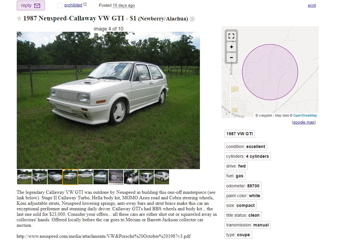 Unfortunately, that also means this car won’t go cheap. The owner even says in the listing if they don’t see sufficient interest on craigslist, it’s going to one of the major auto auctions. To that I say, stop – just put it on eBay! This type of vehicle will definitely drive sufficient interest, especially with mileage on the low side for a 1987 model. Personally, as someone who grew up readingΒ European CarΒ magazine and ripping pages out for wall decoration in my bedroom, I would love to own this car and wouldn’t change a thing about it. No matter how garish it may seem today, this GTI and others like are effectively heirlooms of a bygone era.