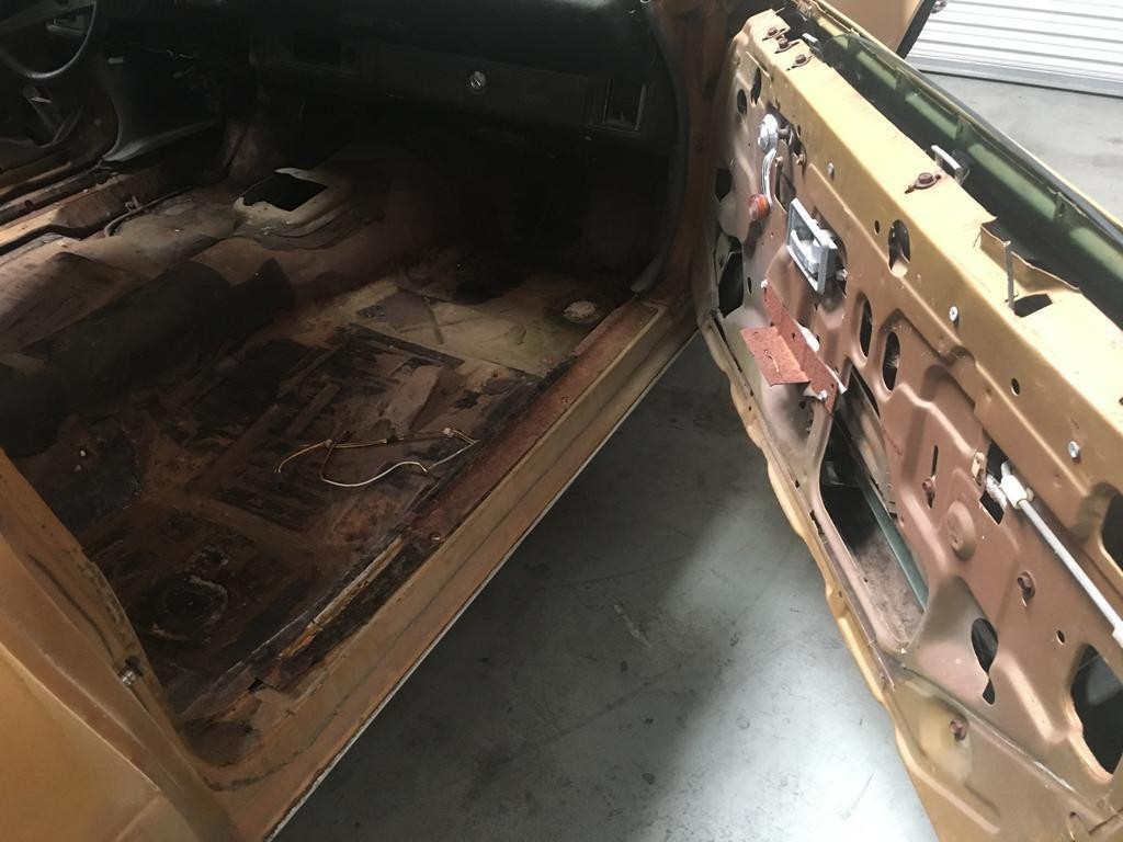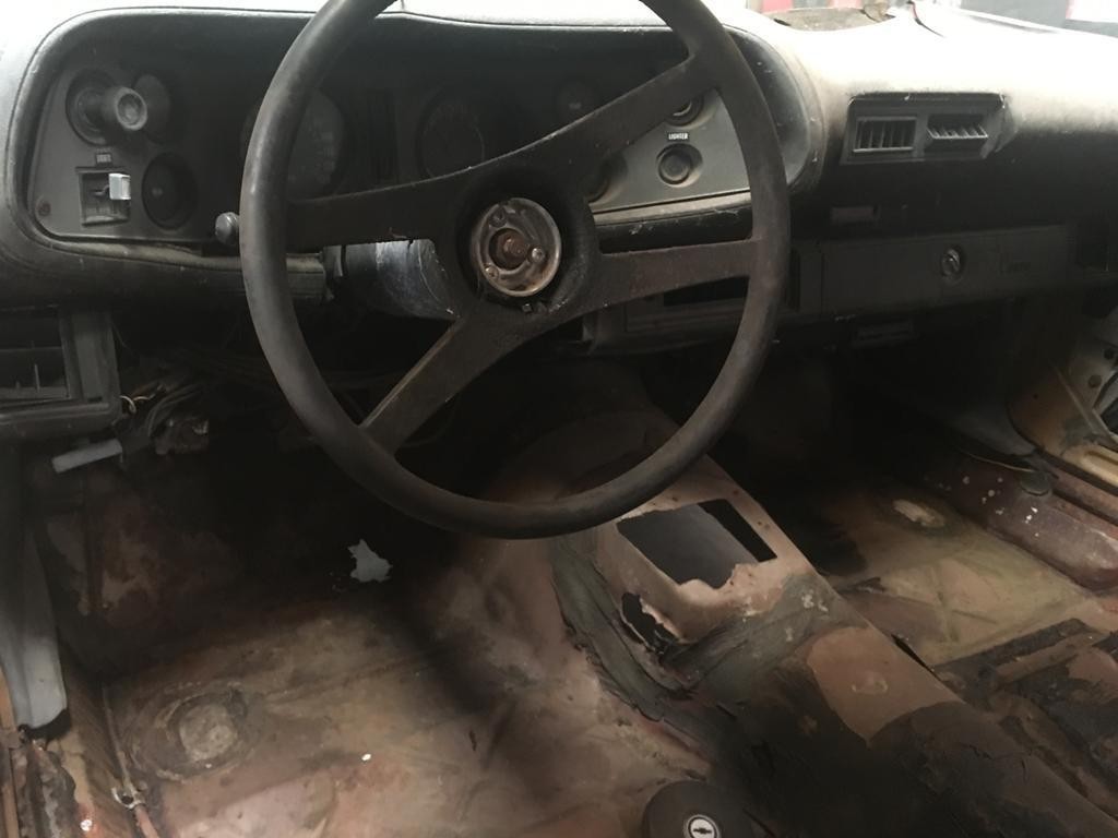 Inside, we find a dash, a steering wheel, and little else. Thankfully the carpet and insulation was ripped out before more rust damage occurred through the retention of moisture. The seller tells us that all of the missing plastic in the originally black interior is accounted for. It is unfortunate that the picture doesn’t give us a good look at the upper part of the dash. The only clue is the statement that it has “a curl.” We are told that this car has been sitting for a while. The rust tells us that this was probably storage outside, and sunlight can destroy a dash in short order.