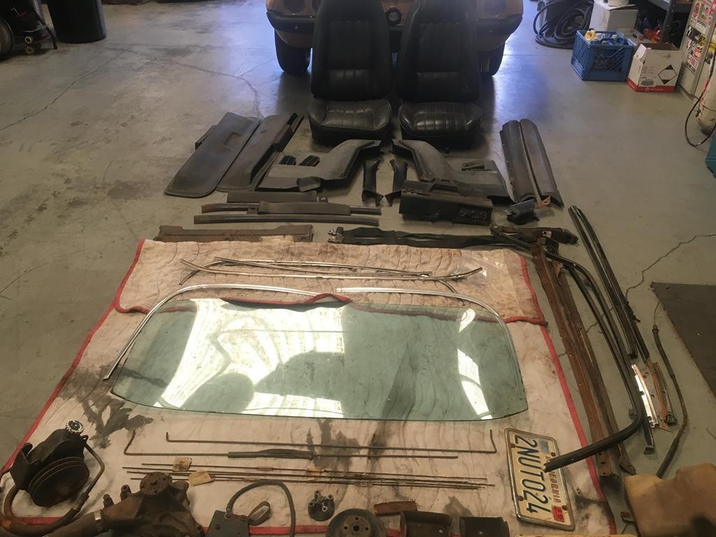 We don’t have a shot of what’s under the hood because there is nothing much still there. Too bad we cannot even see what condition the cowl and the rest of the underhood panels are in. We do have a picture of all the parts that will come with the car. As promised, most of the interior bits are there along with the back glass and various other trinkets. Still, there is a lot of car still missing, and a lot of work to be done before you are cruising down the road.