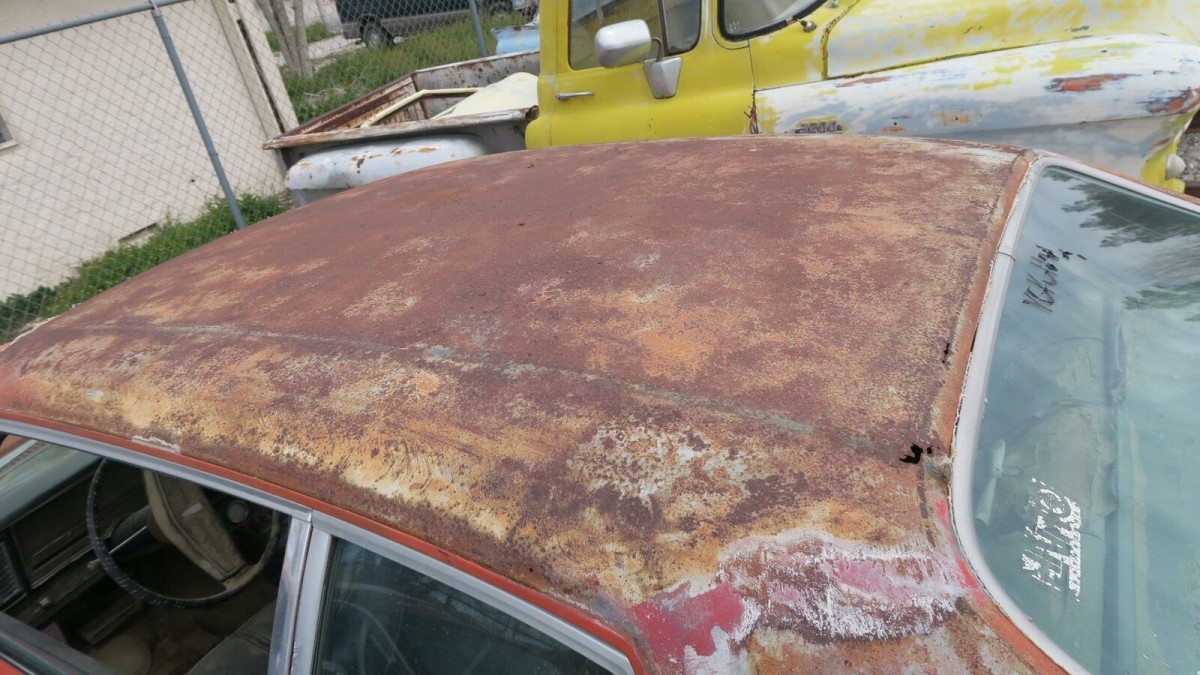What the seller does provide is numerous underneath pictures showing a straight and solid car, revealing a minor spot on the bottom of the door. There is a bucket above one of the mufflers? The car originally had a vinyl roof, and the California sun seems to have gotten the best of it, with the owner removing the rest. There is a spot on the roof above the rear window which looks like rust through but is hard to tell. This may be a problem. Vinyl roofs can be evil, holding moisture against non-painted metal. The roof should be painted or treated as soon as possible to avoid further damage. Overall the exterior paint looks quite usable as is.