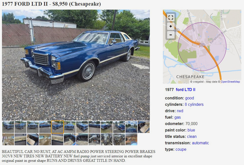 The engine is the base 302-cu.in. OHV V8 with 130 horsepower and 243 lb-ft of torque. It’s sent through a three-speed automatic to the rear wheels, and it’s said to be in beautiful condition, with a new fuel pump, new battery, and new tires. It looks fantastic to me. Any thoughts on this LTD II, or 1977, in general?