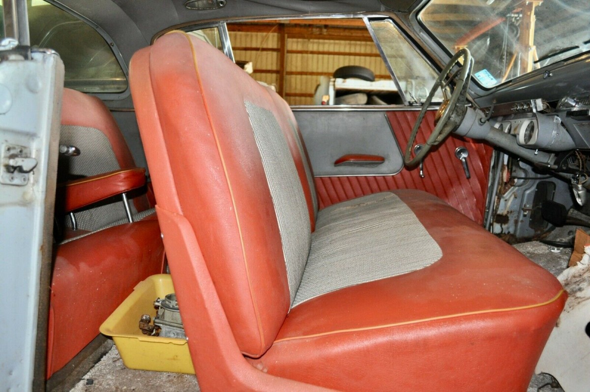1954 models would be little changed from 1953 and total Studebaker production that year would number 68,708 cars. The Commander would be nearly half that at 31,570 units and the Starliner just 5,040. Nothing like the numbers put up by Chevy, Ford, or any of the Chrysler brands. From the photos provided, it looks as though this ’54 Commander has spent a lot of time indoors in a big garage. There is at least one other vintage car in there as well. There some surface rust here and there and we’re not sure about the floorboards. The worse spot may be around where the radio antenna sits on the fender. If not attended to, that could turn into a hole. The seller doesn’t indicate any problems with the undercarriage. When new, it probably looked good with black or dark blue over light blue paint.