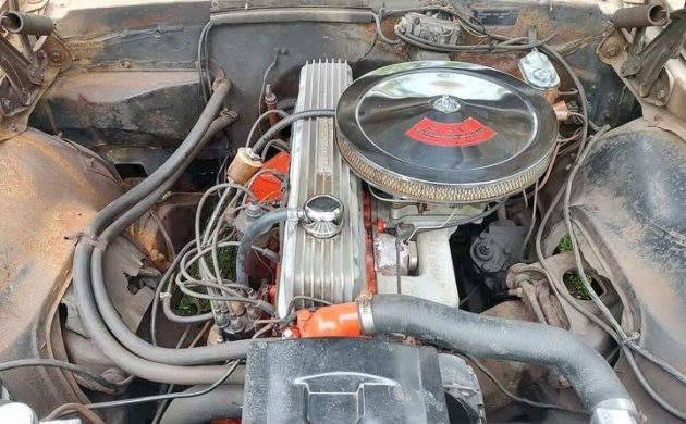 Not original/or stock engine. Cast aluminum valve cover is a giveaway. Non-stock adapter to mount that 2bbl Holly carburetor and air cleaner. Would also be interesting to see if the choke rod actually works correctly with the Holly install. I’ve already owed a rusty ’67 Camaro convertible. I enjoyed the car once I had installed good shocks (,Bilstein) on it. But I also had a 327 to move it down the road. It made a fun drive to work car.