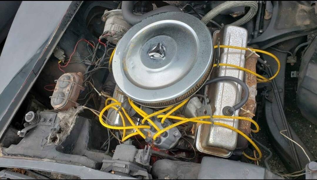 The damage to the firewall looks like the result of a fire. Part of the left side looks like it’s had some kind of so so repair work done to it, but the frayed hole on the top, looks just like what Corvette fiberglass looks like after a fire. Besides the firewall, the wiring’s a mess, and the right inner fender skirt appears to be missing, or broken up as a result of whatever happened to the nose. It doesn’t look like the fan shroud’s there either? The heater hose is routed back into the block, so either the core’s bad, or from looking at the interior pictures, maybe gone altogether?